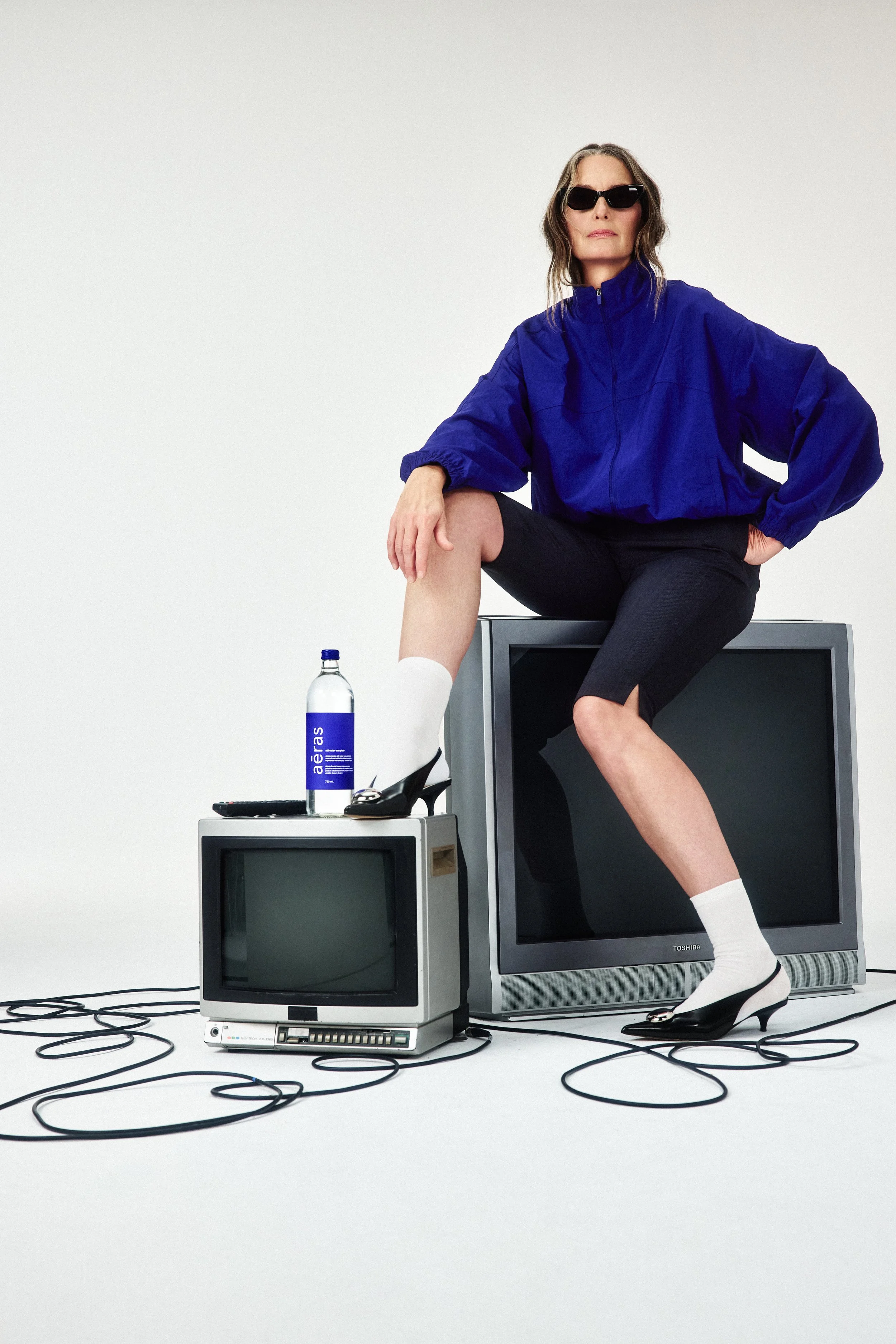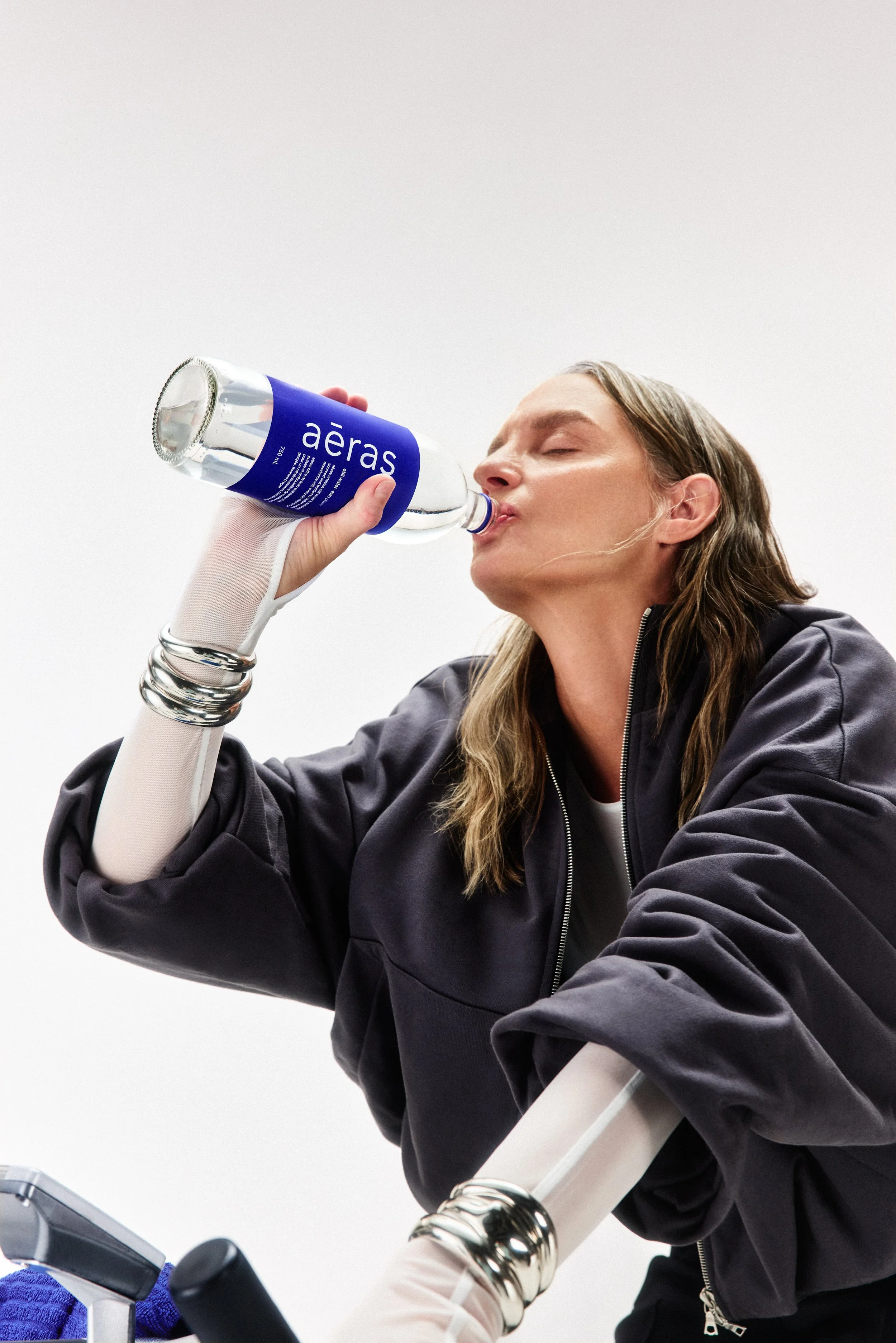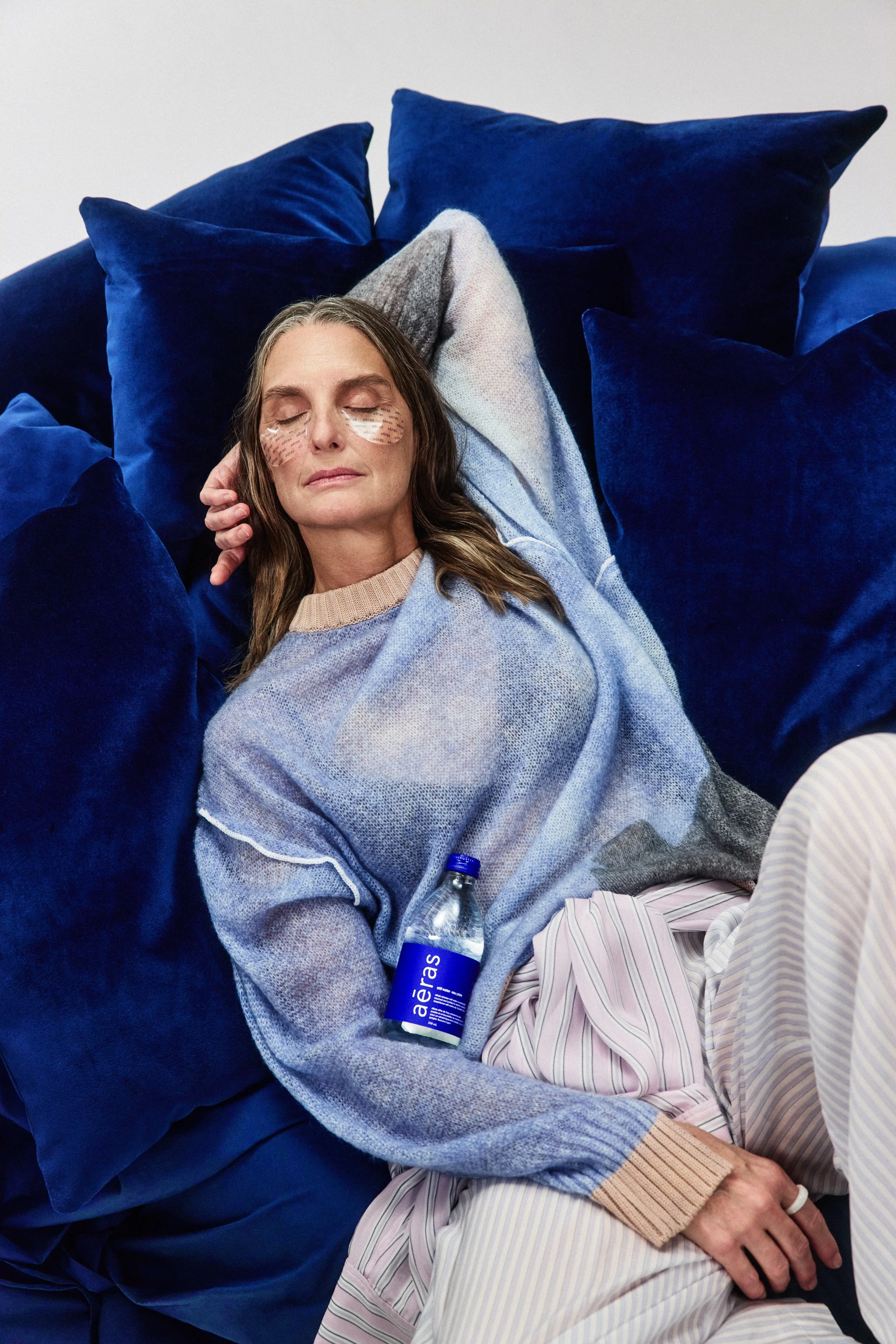 The butter and toast crystallized the idea. They are nostalgic and universally accessible, and by placing aēras within that ritual, the ordinary becomes considered. The sleep scene grew from thinking about The Princess and the Pea and the idea of comfort layered to excess. The workout concept was inspired by 90s fitness culture, when people used water bottles as makeshift weights. Each vignette reflects something accessible, presented with precision and polish.